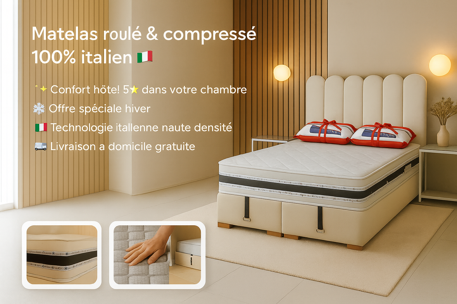 🇮🇹 Matelas roulés & compressés 100% italiens — confort premium, soutien parfait du dos.